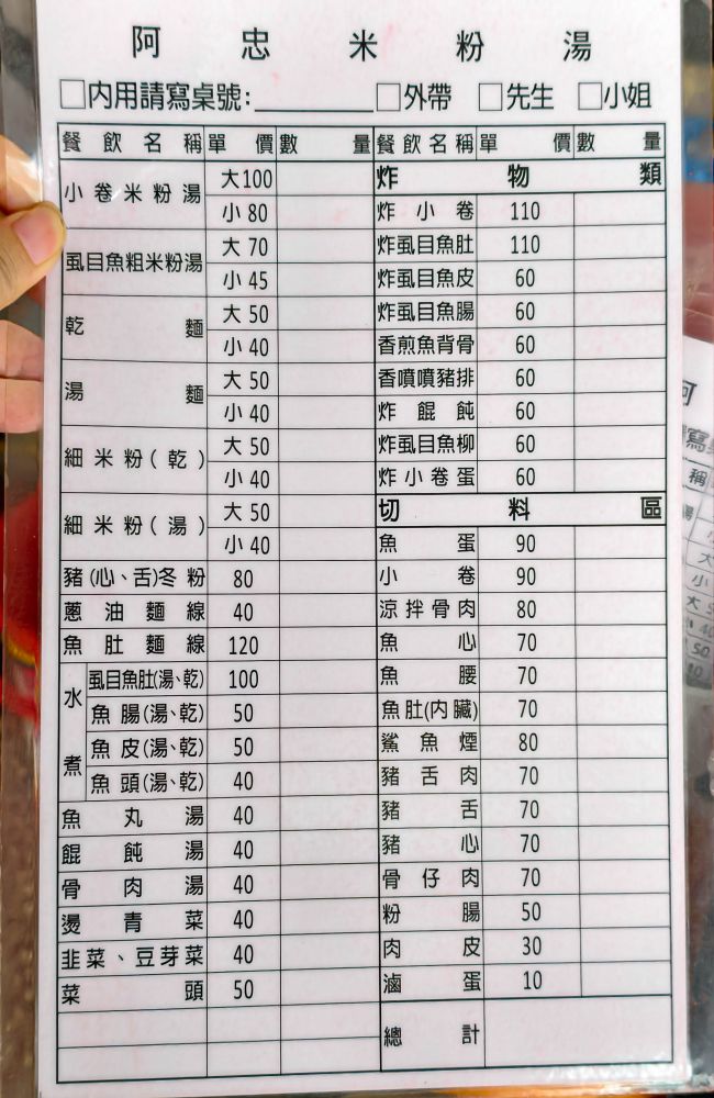 阿忠虱目魚米粉湯的菜單,有米粉湯、乾麵、麵線、炸物、切料區…等,選擇豐富多元。