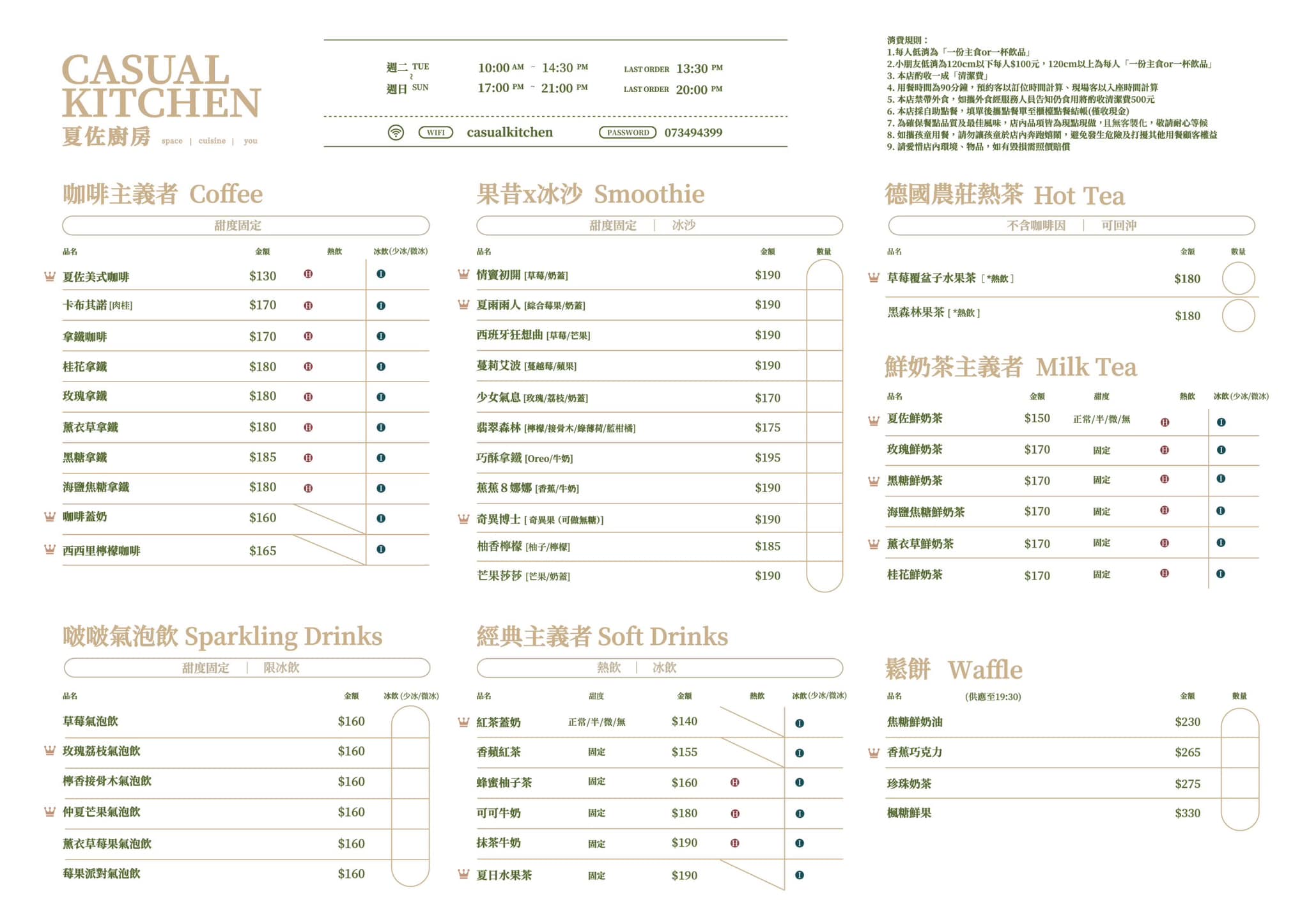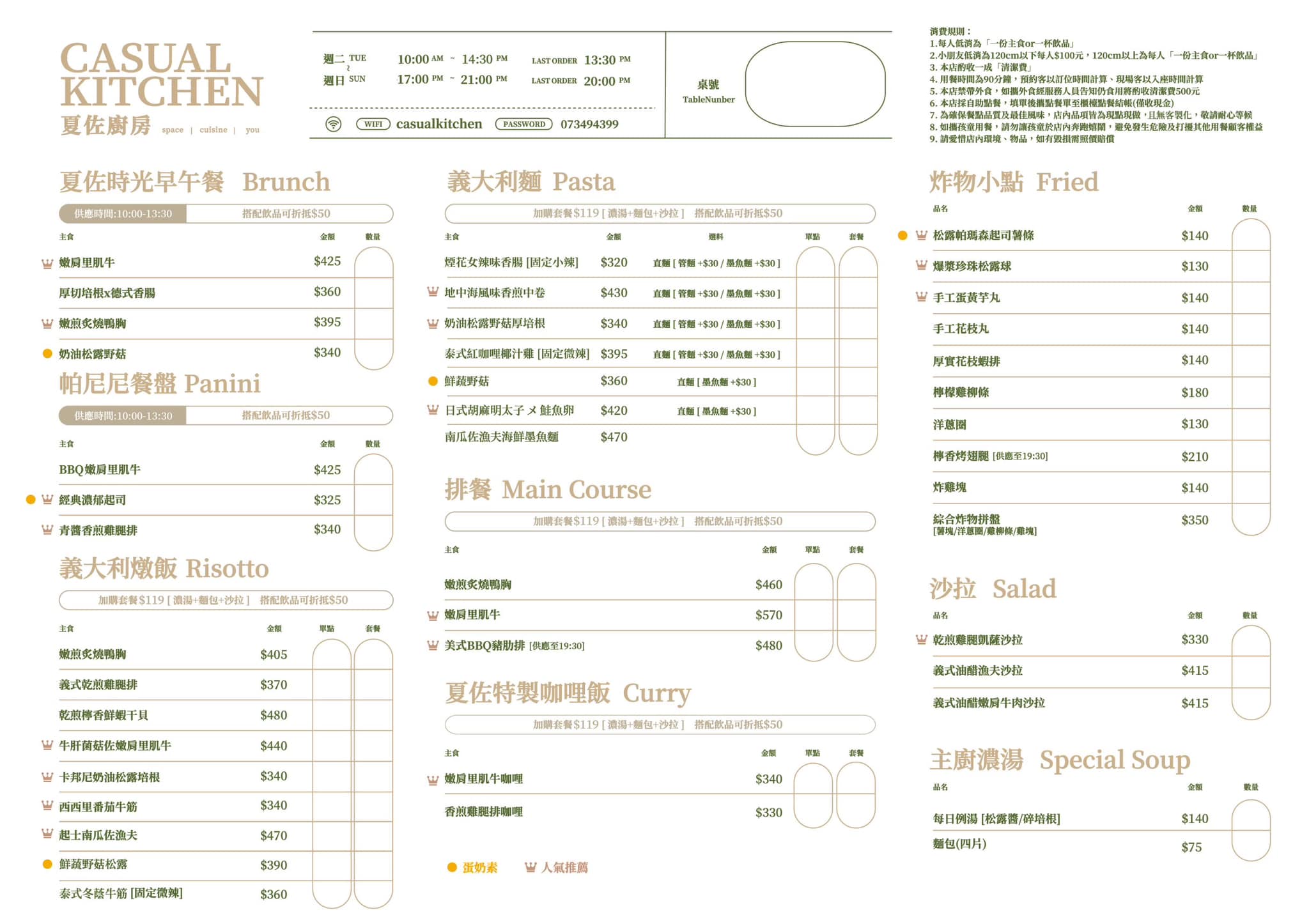 夏佐廚房的菜單選擇很多元,有早午餐、帕尼尼餐盤、義大利燉飯、義大利麵、排餐、咖哩飯、炸物、沙拉、濃湯、咖啡、氣泡飲、熱茶、果昔冰沙、鬆餅…….等等,選擇豐富多元,是間很適合聚餐的餐廳。