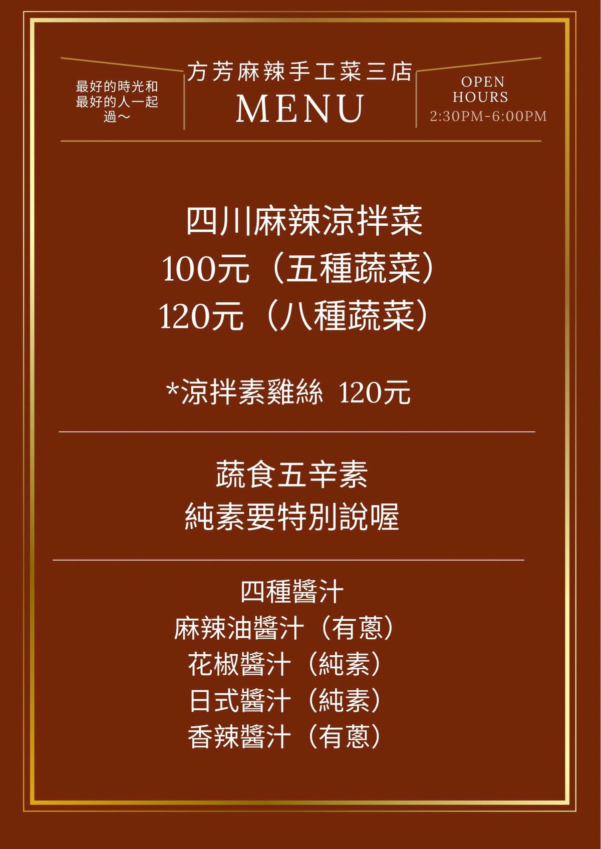 方芳麻辣手工菜3店,以麻辣風味的涼拌菜為主打,打造與前兩店不同的清爽選擇,這裡的餐點皆為五辛素(全素可事先告知),特別適合想吃辣、卻又想兼顧輕盈飲食的人,嚴選新鮮食材搭配特製麻辣醬汁,讓每一道涼拌料理都能吃出麻而不嗆、辣而不燥的層次風味。