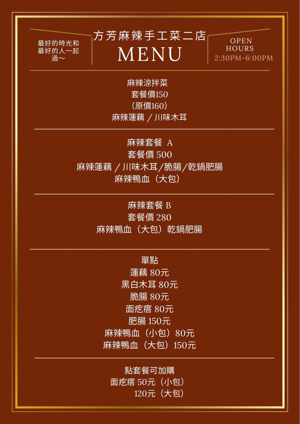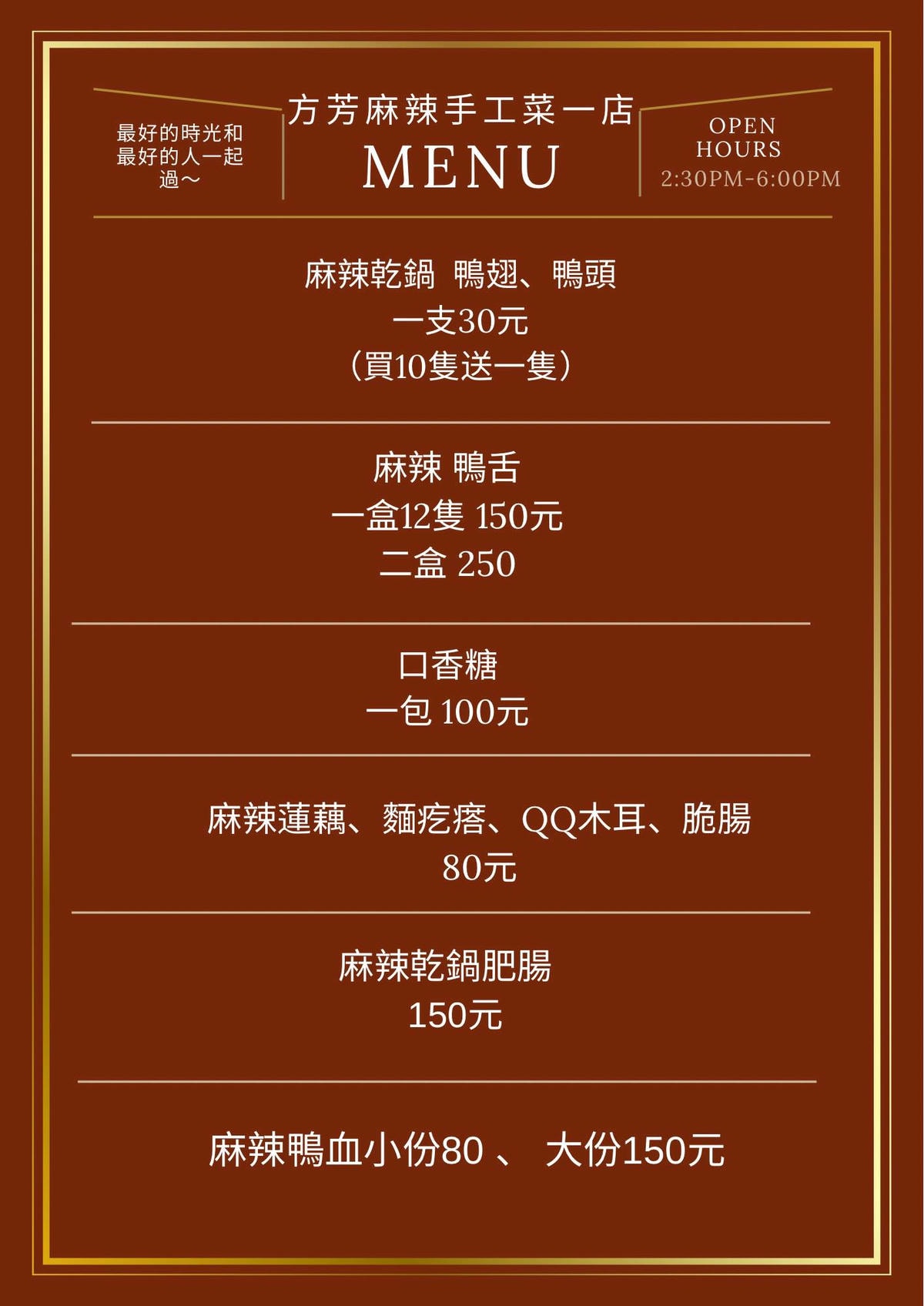 - 方芳麻辣手工菜2店(麻辣鴨血) 自由黃昏市場3街10號 PM 2:30~PM 6:00