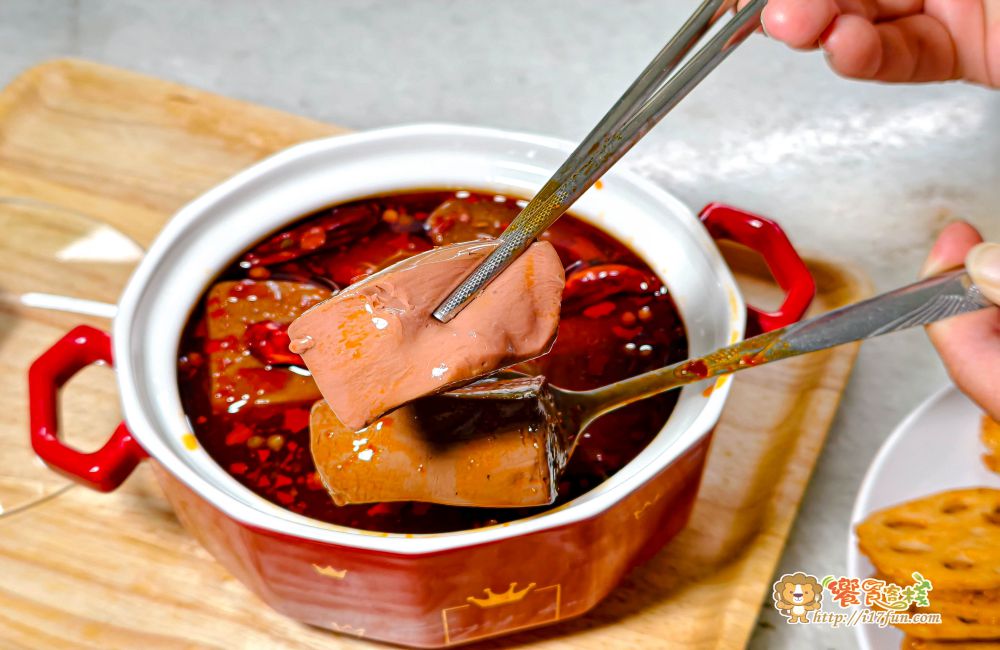 純正鴨血切開後表面平滑細緻,沒有毛細孔卻依然能完整吸附湯汁,每一口都柔軟鮮嫩、滑順入喉,帶出滿滿麻辣香氣,滋味濃郁而迷人。