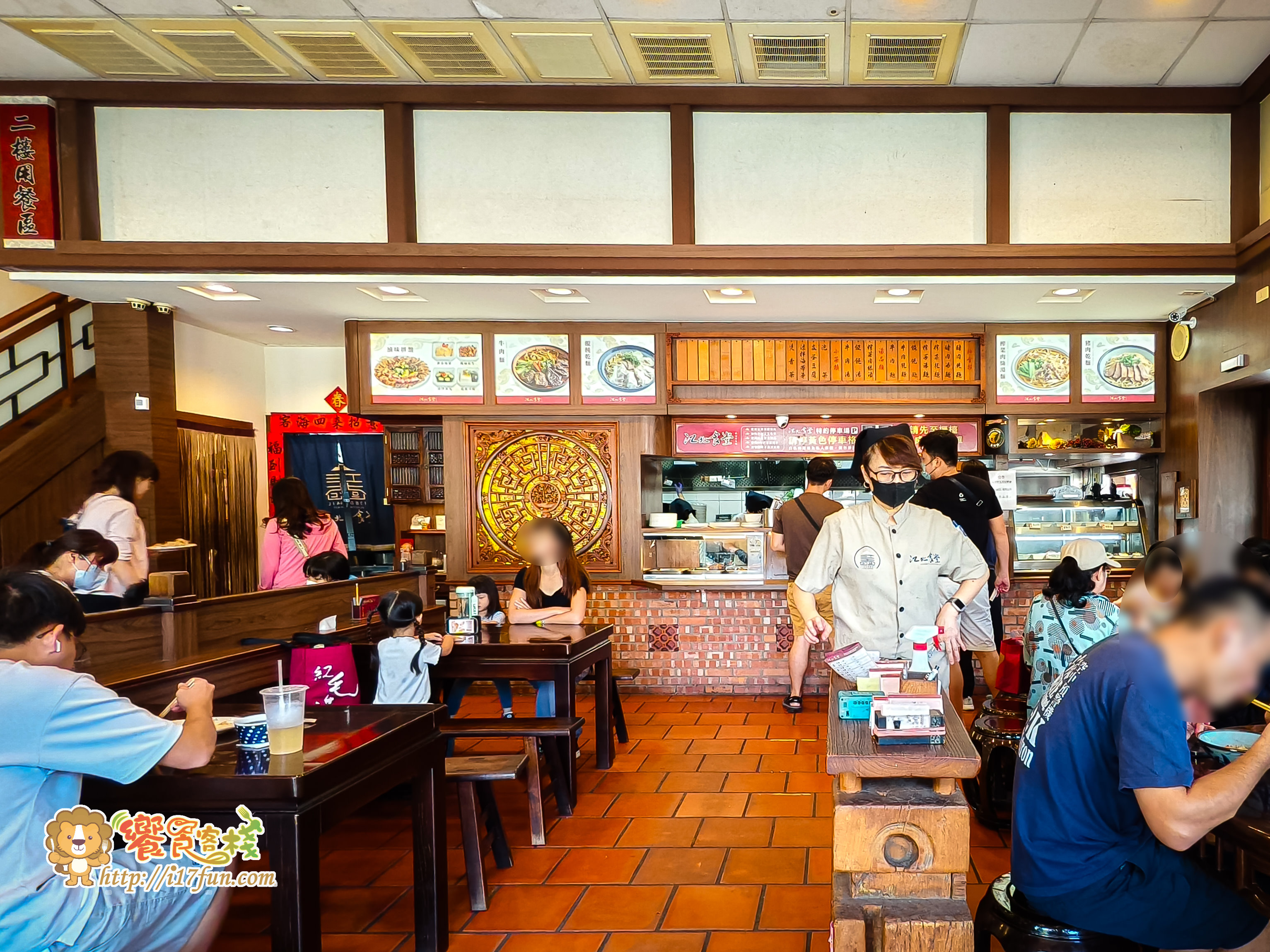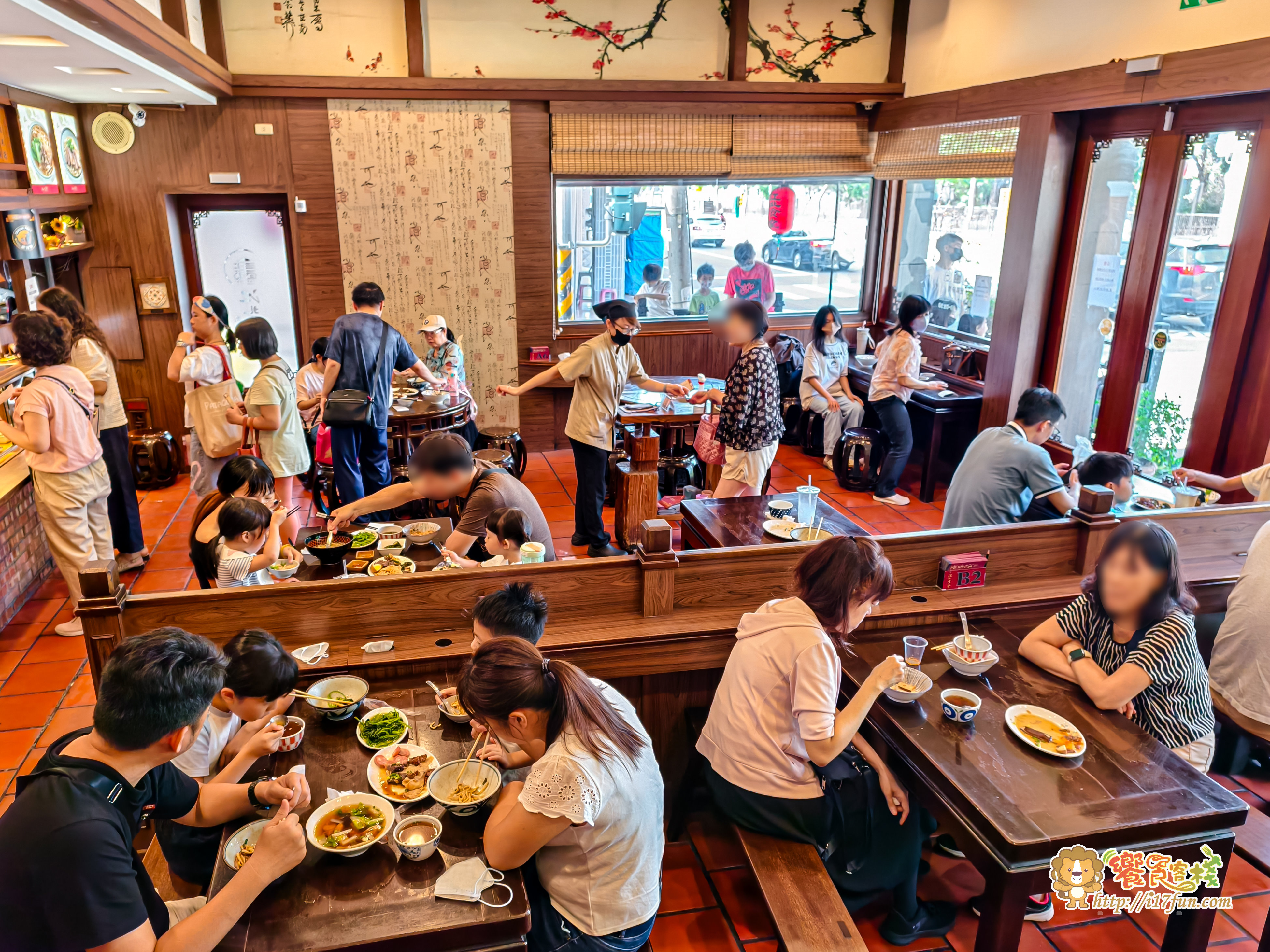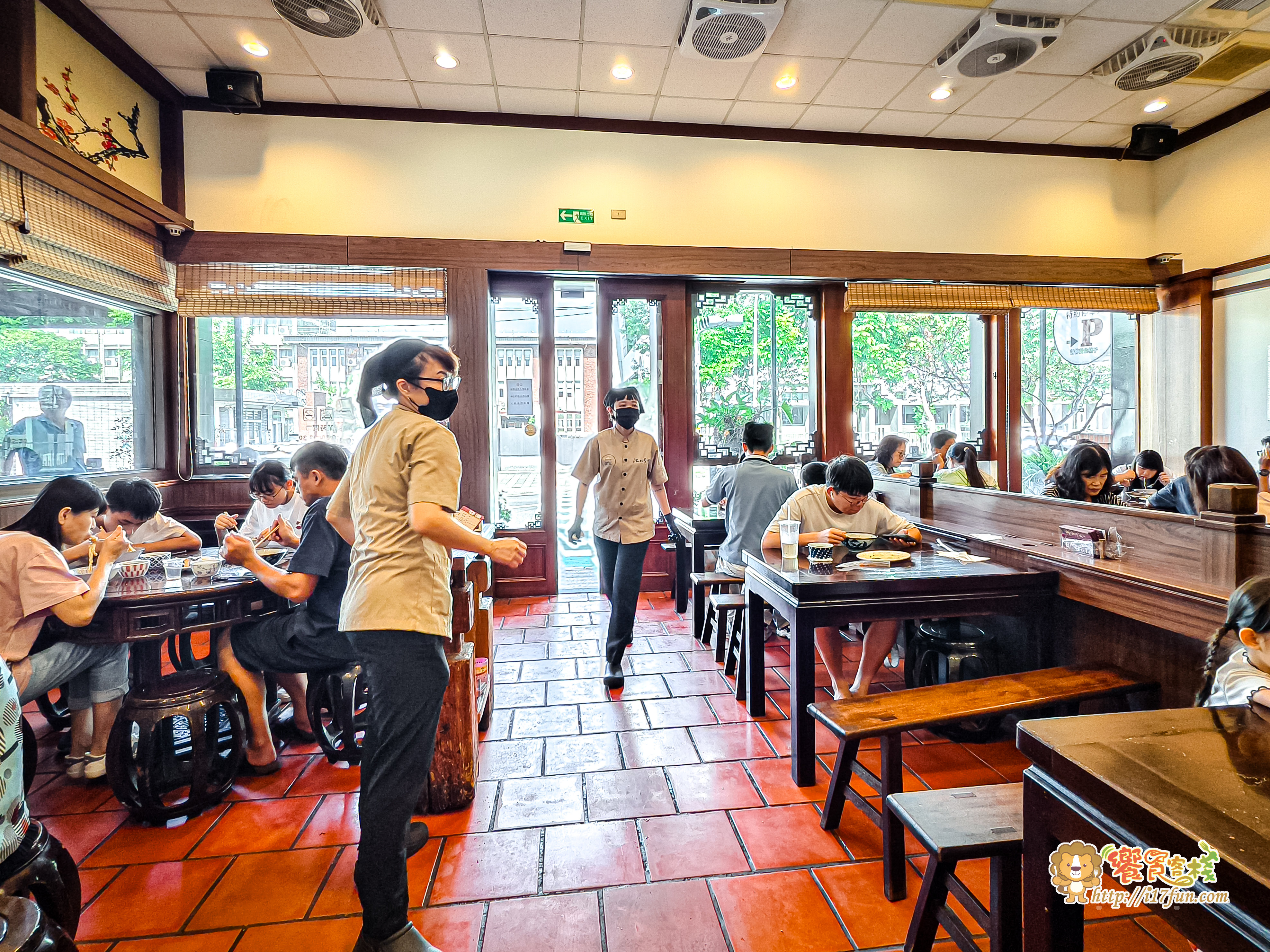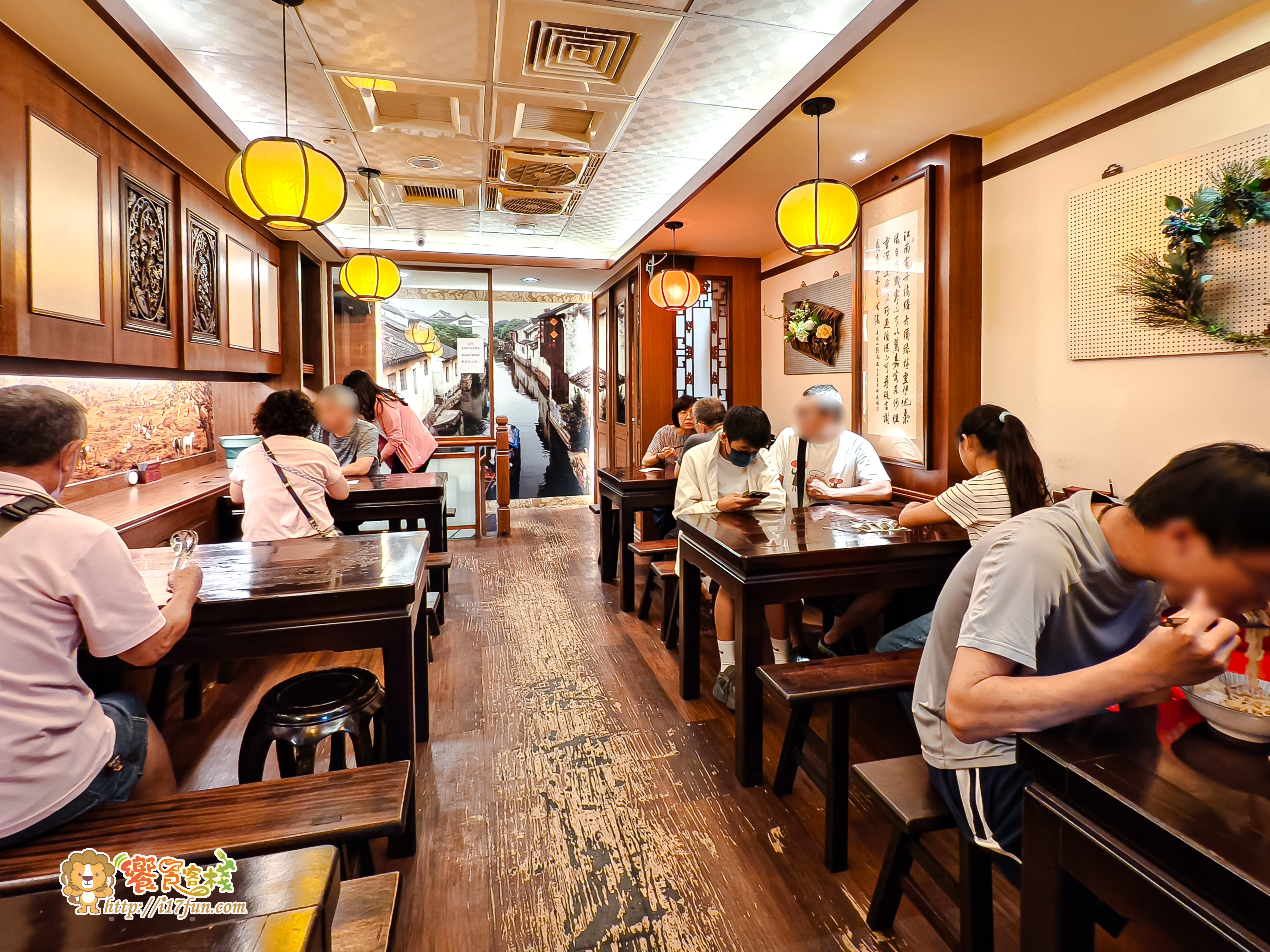 江北食堂風味外省麵的用餐空間共有兩層樓,整體裝潢以濃厚的中國風為主調,木質桌椅與紅磚元素營造出古色古香的氛圍,彷彿走進懷舊客棧般充滿韻味。