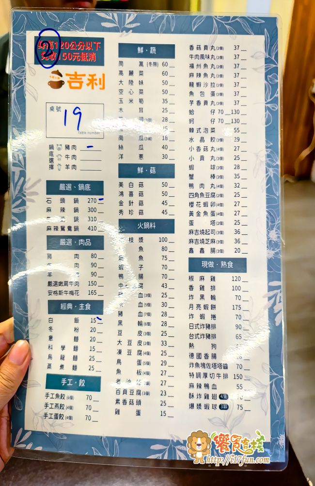 吉利火鍋的菜單,選擇豐富多元,除了鍋物之外,還有牛排、炸物…等等選擇。