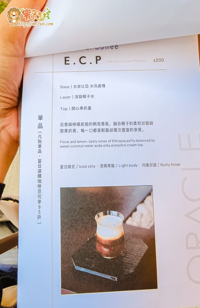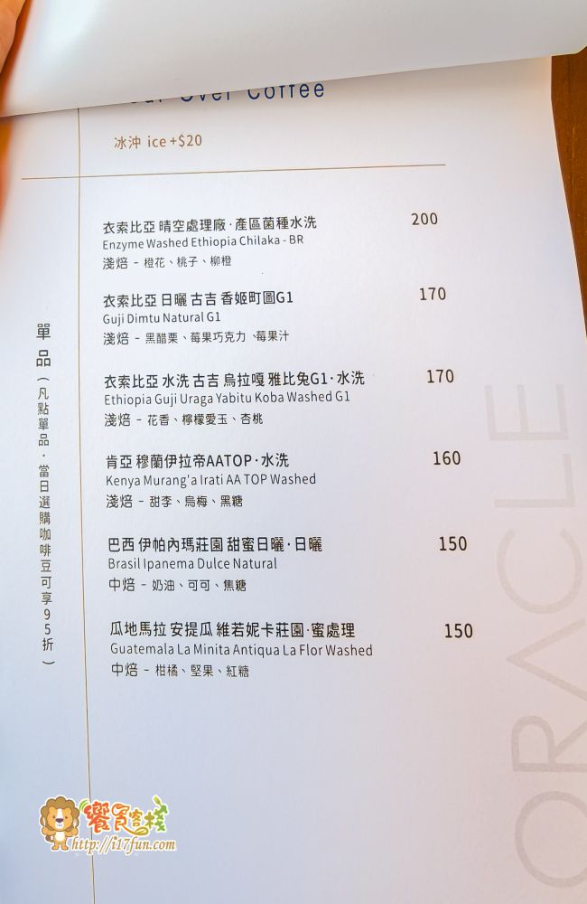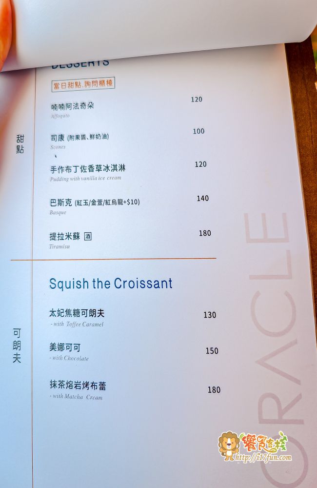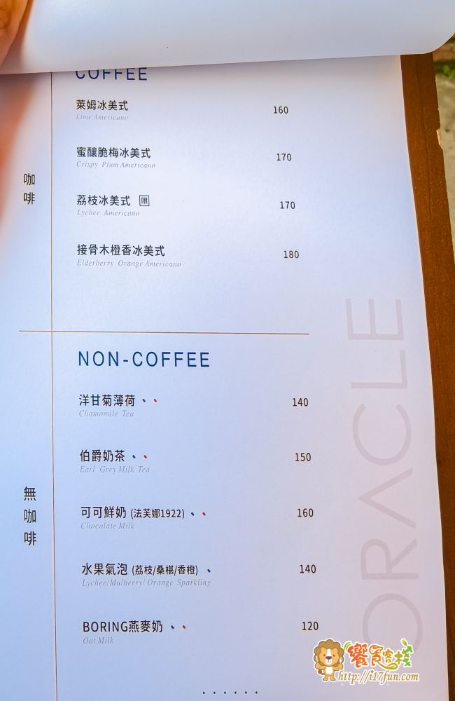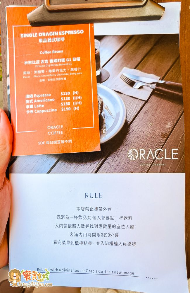 神諭咖啡的菜單選擇很多元,除了有咖啡、飲品之外,也有提供甜點、鐵鍋鬆餅、輕食…等選擇,低消一杯飲品,客滿時用餐時間限制90分鐘。