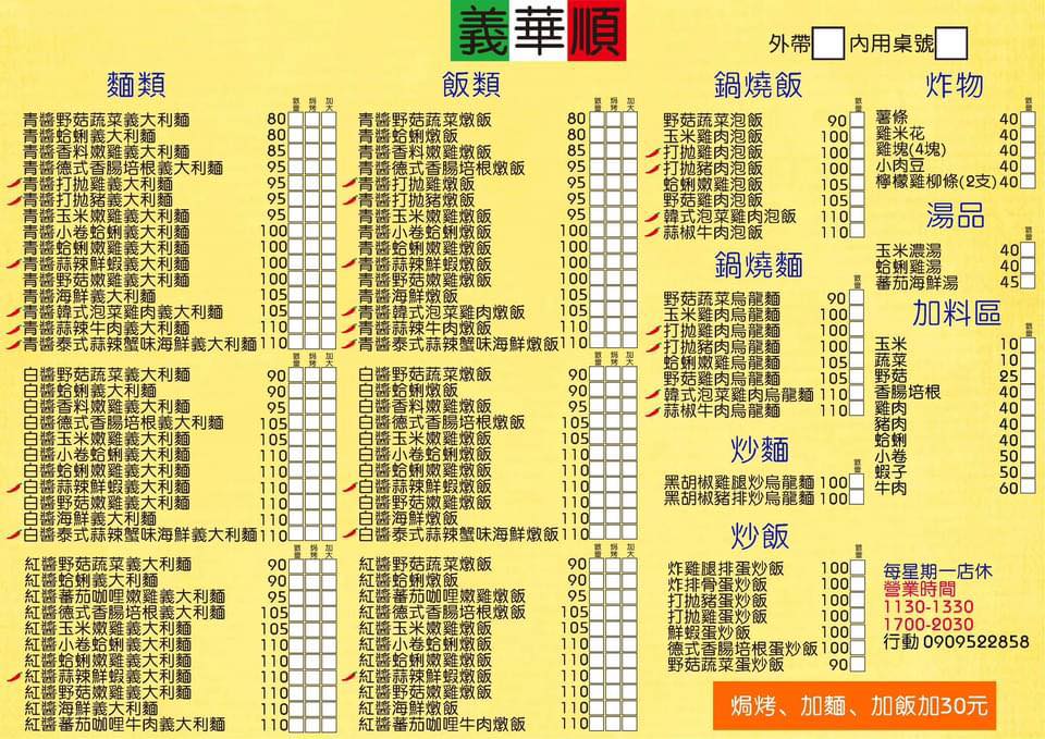 義華順的菜單,餐點選擇超多元,有麵類、飯類、鍋燒飯、 鍋燒麵、炒麵、炸物、湯品…. 等等,高達90幾種選擇,餐點價格只要80元起,可以依照自己的喜好選擇餐點,餐點通通百元上下,即使天天吃也不傷荷包。(2024年10月更新菜單)